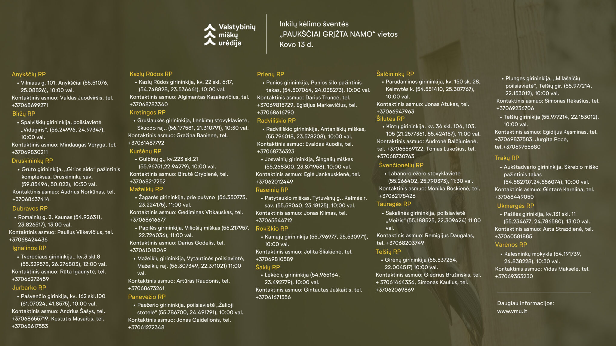 Kviečiame išsirinkti vietą inkilų kėlimo vietų sąraše. Apie dalyvavimą šventėje praneškite miškininkams nurodytais kontaktais. Iki susitikimo miške!