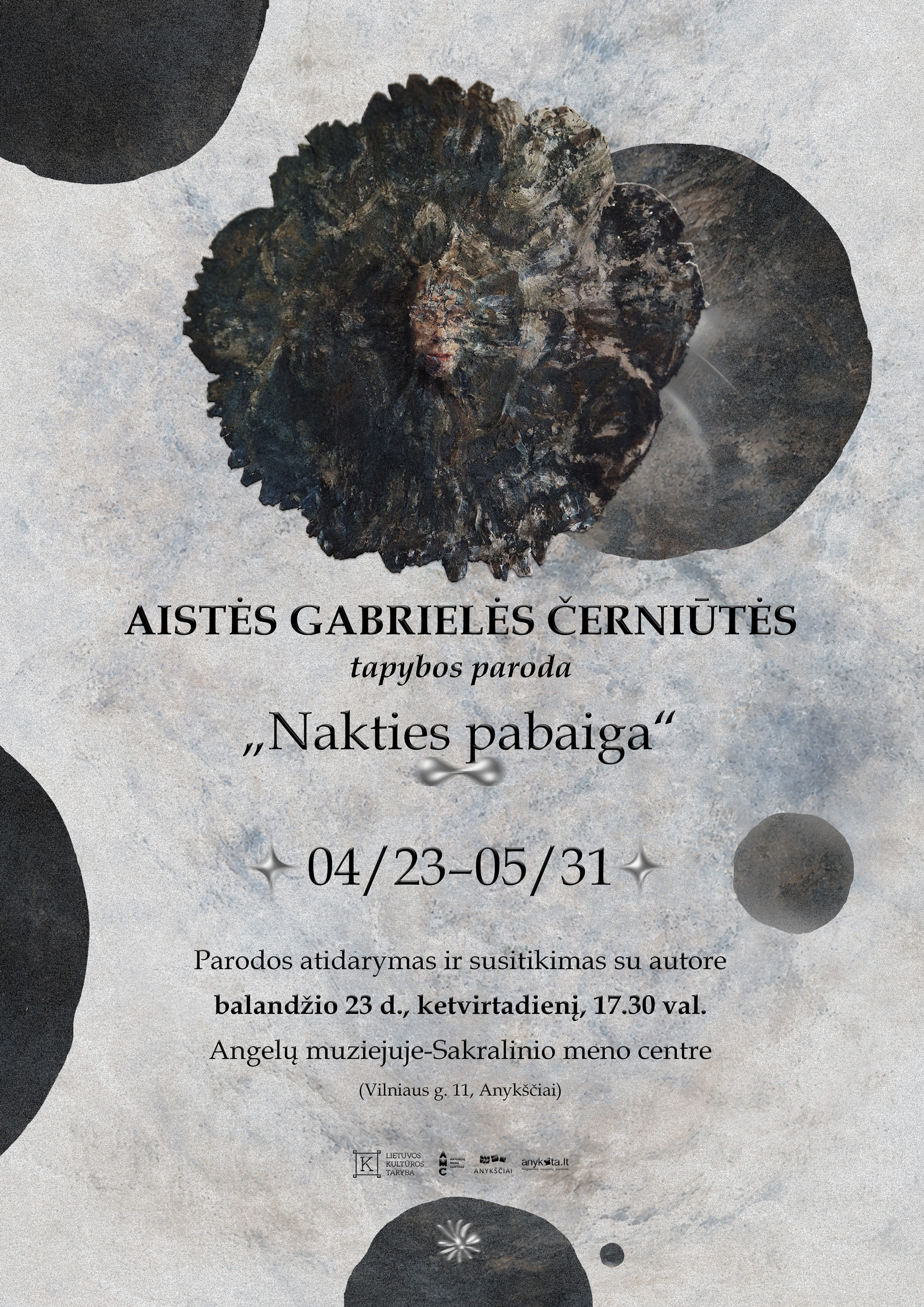 Balandžio 23 d., ketvirtadienį, 17.30 val. kviečiame į Aistės Gabrielės Černiūtės parodos „Nakties pabaiga“ atidarymą Angelų muziejuje-Sakralinio meno centre (Vilniaus g. 11, Anykščiai).