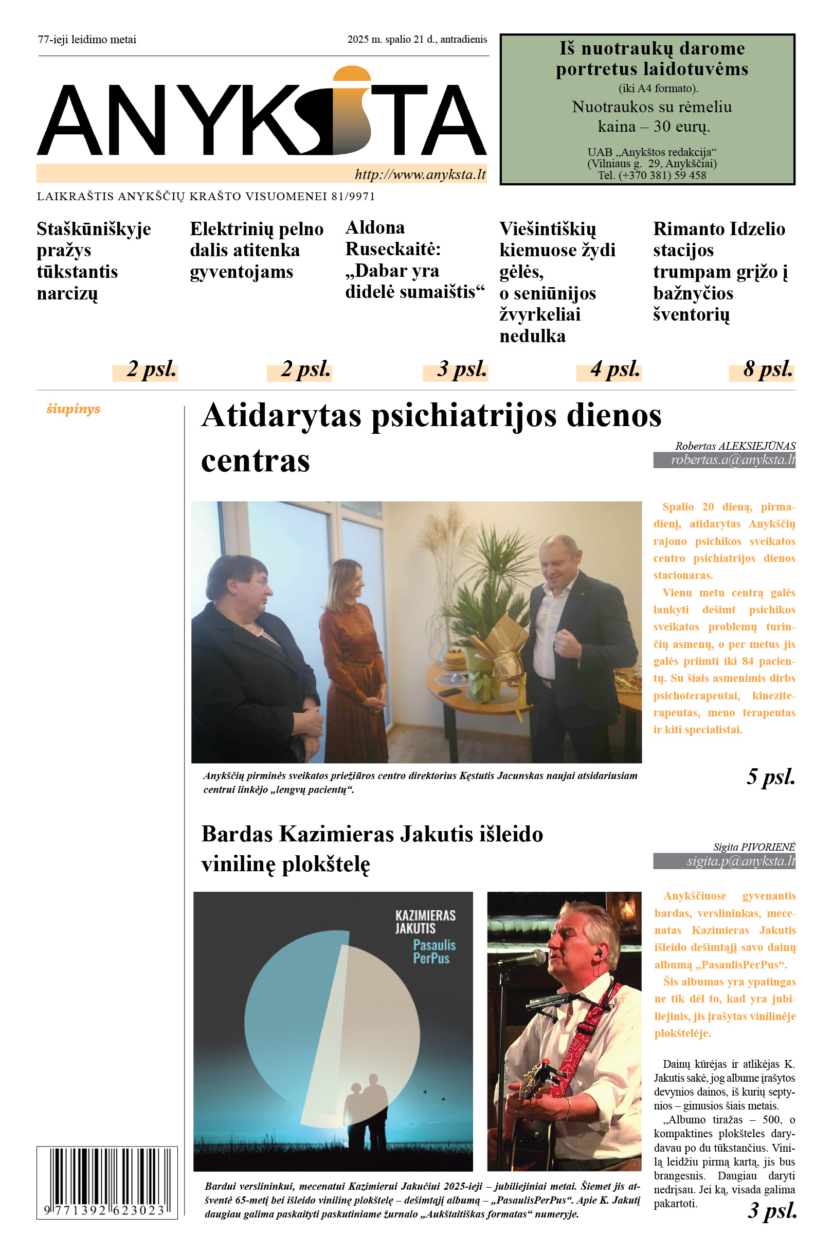 © Anykšta, tel/faksas (8 381) 5 94 58, reklamos skyrius +370 686 33036, el. paštas anyksta@anyksta.lt