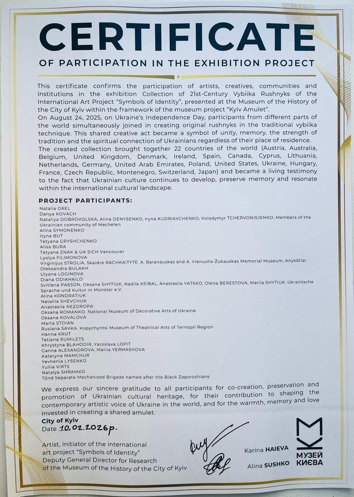 „A. Baranausko ir A. Vienuolio-Žukausko memorialinis muziejus prisijungė prie parodos „XXI amžiaus Vybijka Rushnykai kolekcija“, pristatytos Kyjivo miesto istorijos muziejuje. 2025 m. rugpjūčio 24 d., Ukrainos nepriklausomybės dieną, kartu su kūrėjais iš 22 pasaulio šalių dalyvavome bendrame kūrybiniame procese, puoselėjančiame tradiciją, atmintį ir kultūrinį ryšį. Šis projektas – tai gyvas vienybės ir Ukrainos kultūros stiprybės simbolis, jungiantis bendruomenes visame pasaulyje”, – žinute pasidalijo V. Strolia.