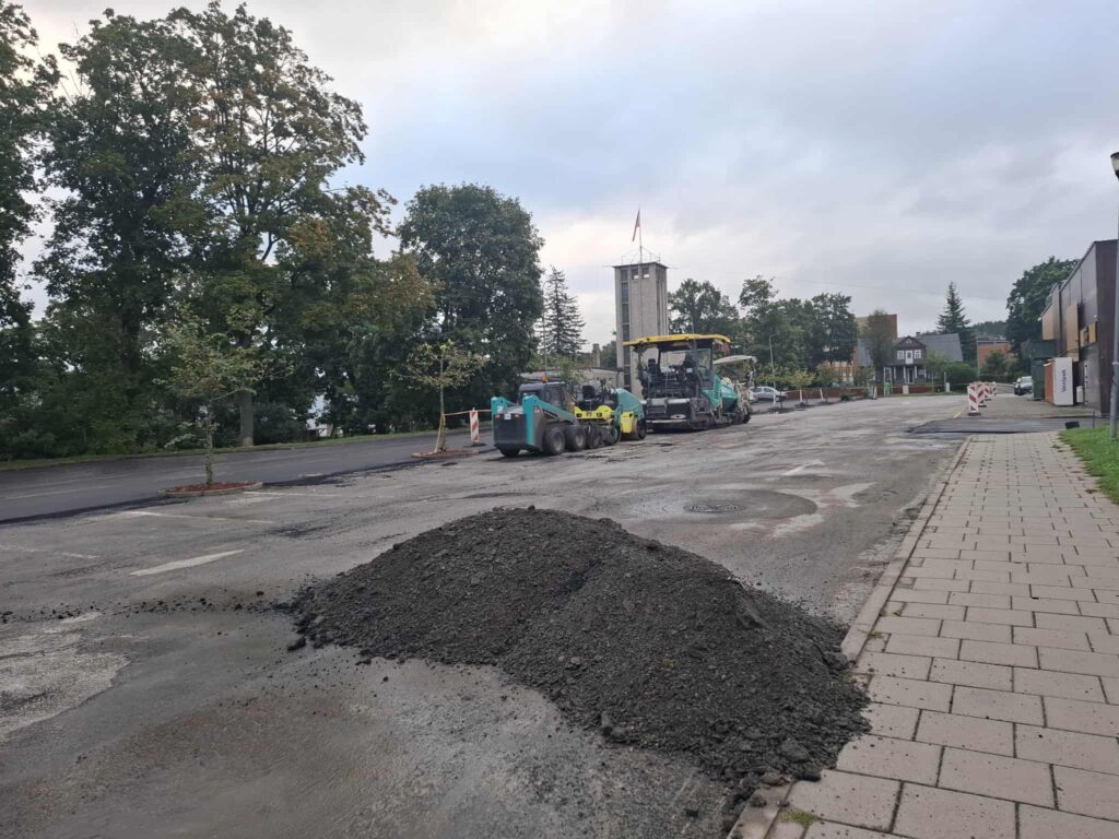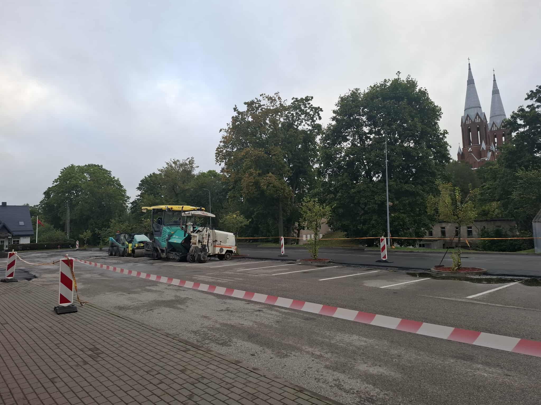 Anykščiuose, Vilniaus gatvėje, įpusėjo prekybos centro „Norfa“ automobilių stovėjimo aikštelės asfaltavimo darbai.