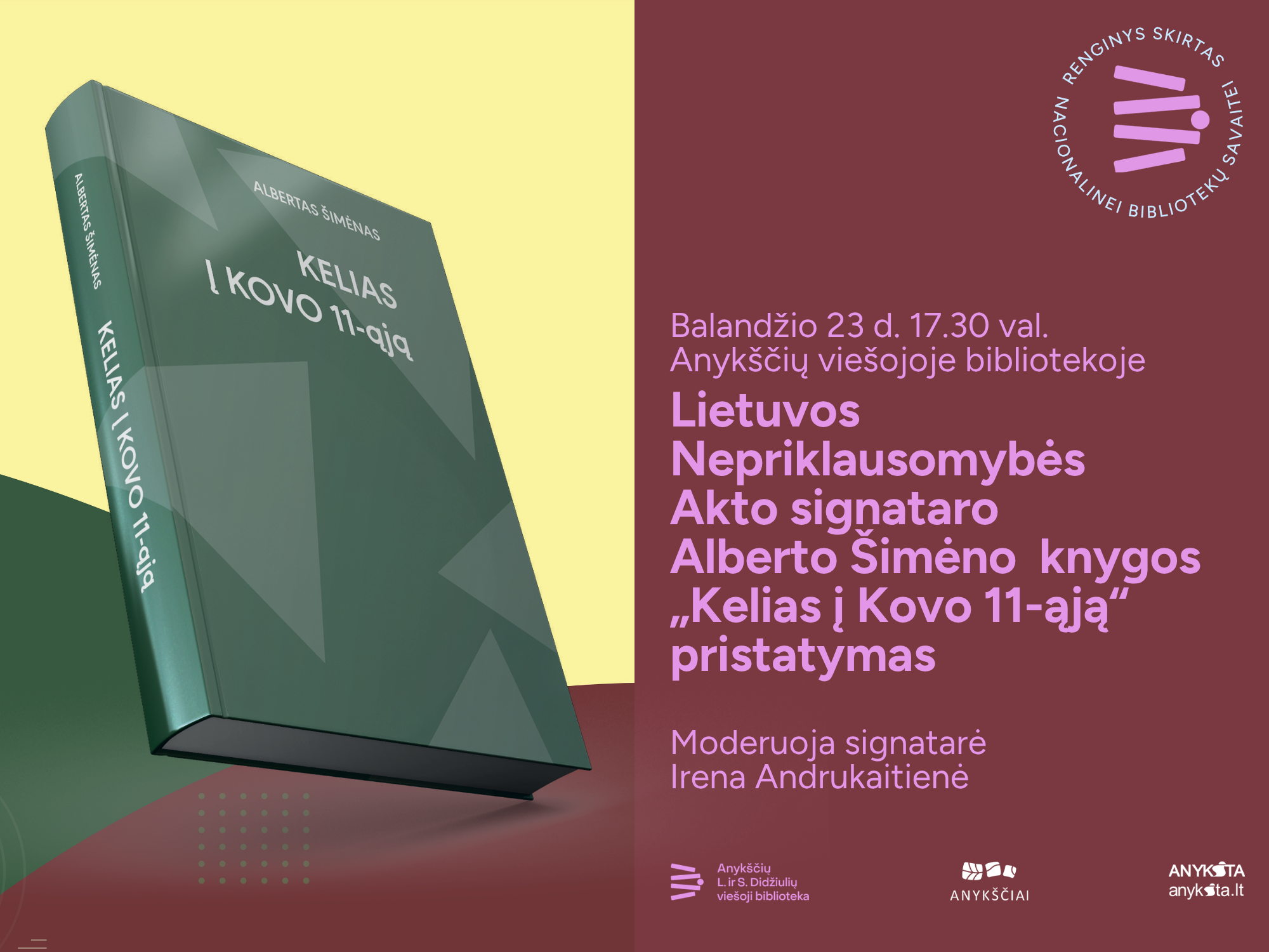 Švęsdami Nacionalinę Lietuvos bibliotekų savaitę, balandžio 23 d. 17.30 val. kviečiame į ekonomisto, Lietuvos politikos bei visuomenino veikėjo, signataro Alberto Šimėno knygos „Kelias į Kovo 11-ąją“ pristatymą. Renginį moderuos Lietuvos Respublikos Aukščiausiosios Tarybos akto dėl Lietuvos nepriklausomos valstybės atstatymo signatarė Irena Andrukaitienė.