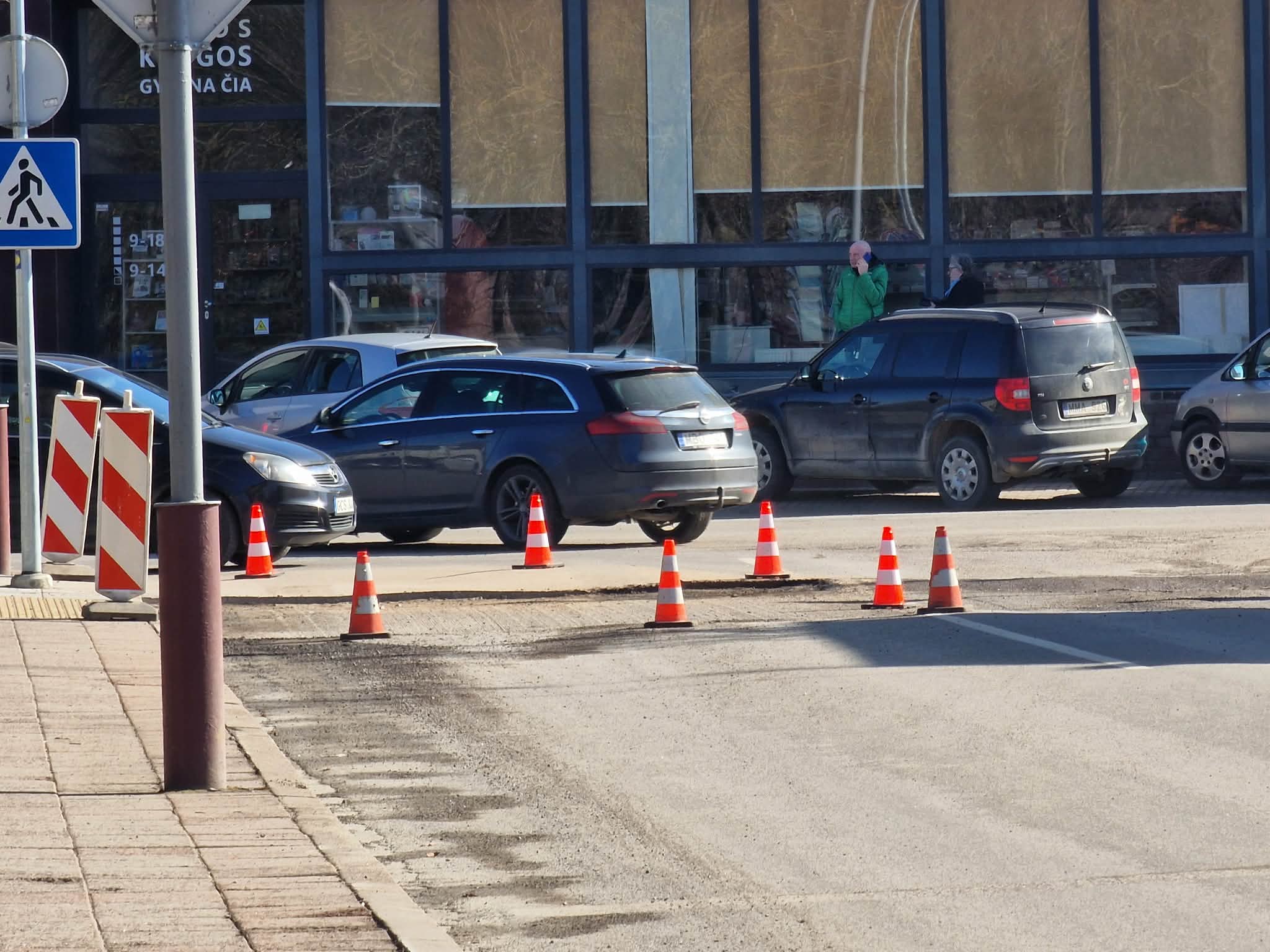 Kelininkai Anykščiuose daužo asfaltą. Asfalto sluoksnis nuimamas pėsčiųjų perėjų vietose.