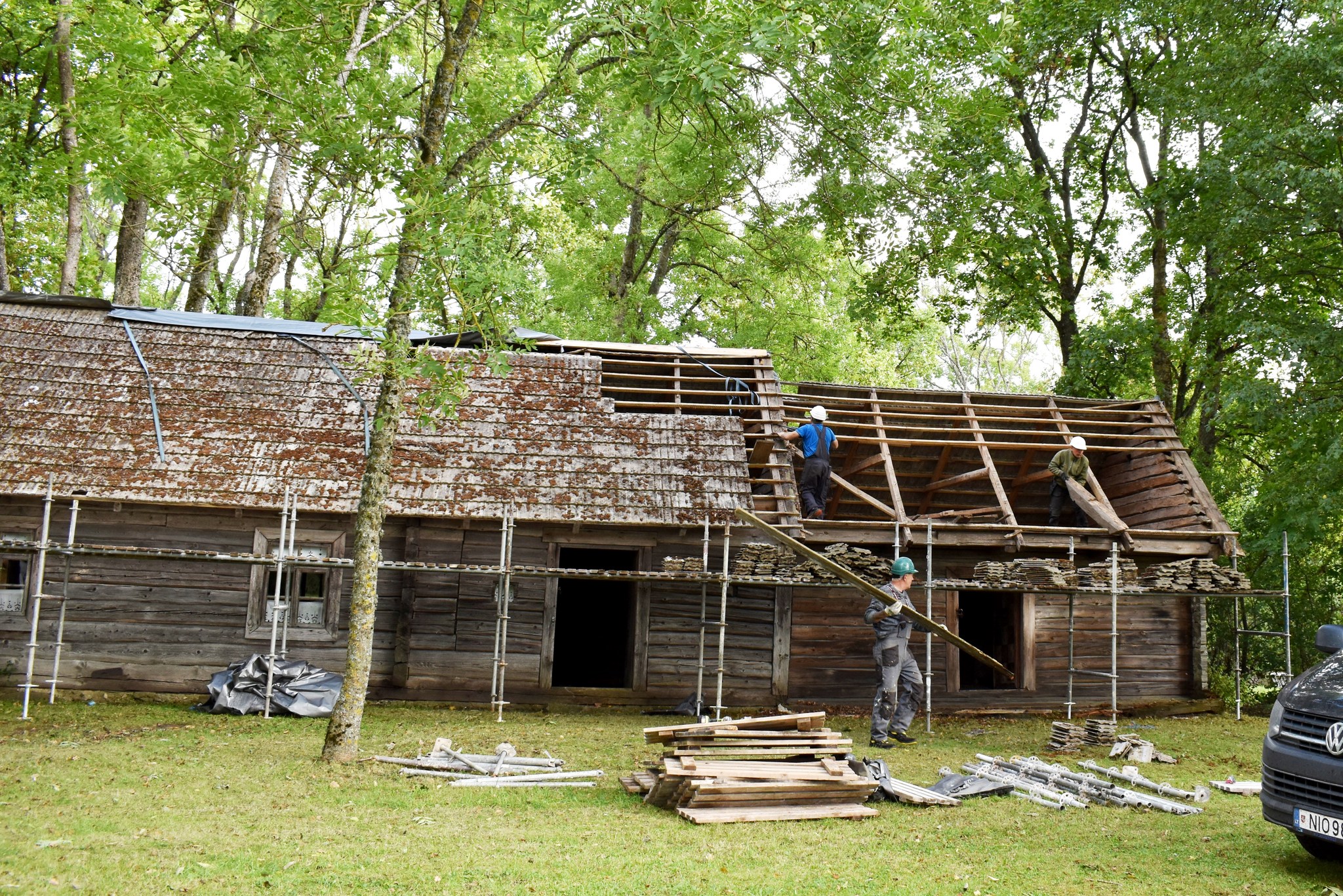 Senajame Malaišių sodžiuje – lietuvių literatūros klasiko kanauninko Juozo Tumo-Vaižganto Tėviškėje – pasibaigus Vaižgantinėms, čia šurmuliuoja statybininkai.