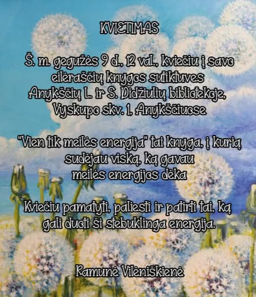 Anykščių rajono mero Kęstučio Tubio patarėja Ramunė Vilėniškienė Anykščių L. ir S. Didžiulių bibliotekoje pristatys savo poezijos knygą „Vien tik meilės energija“.