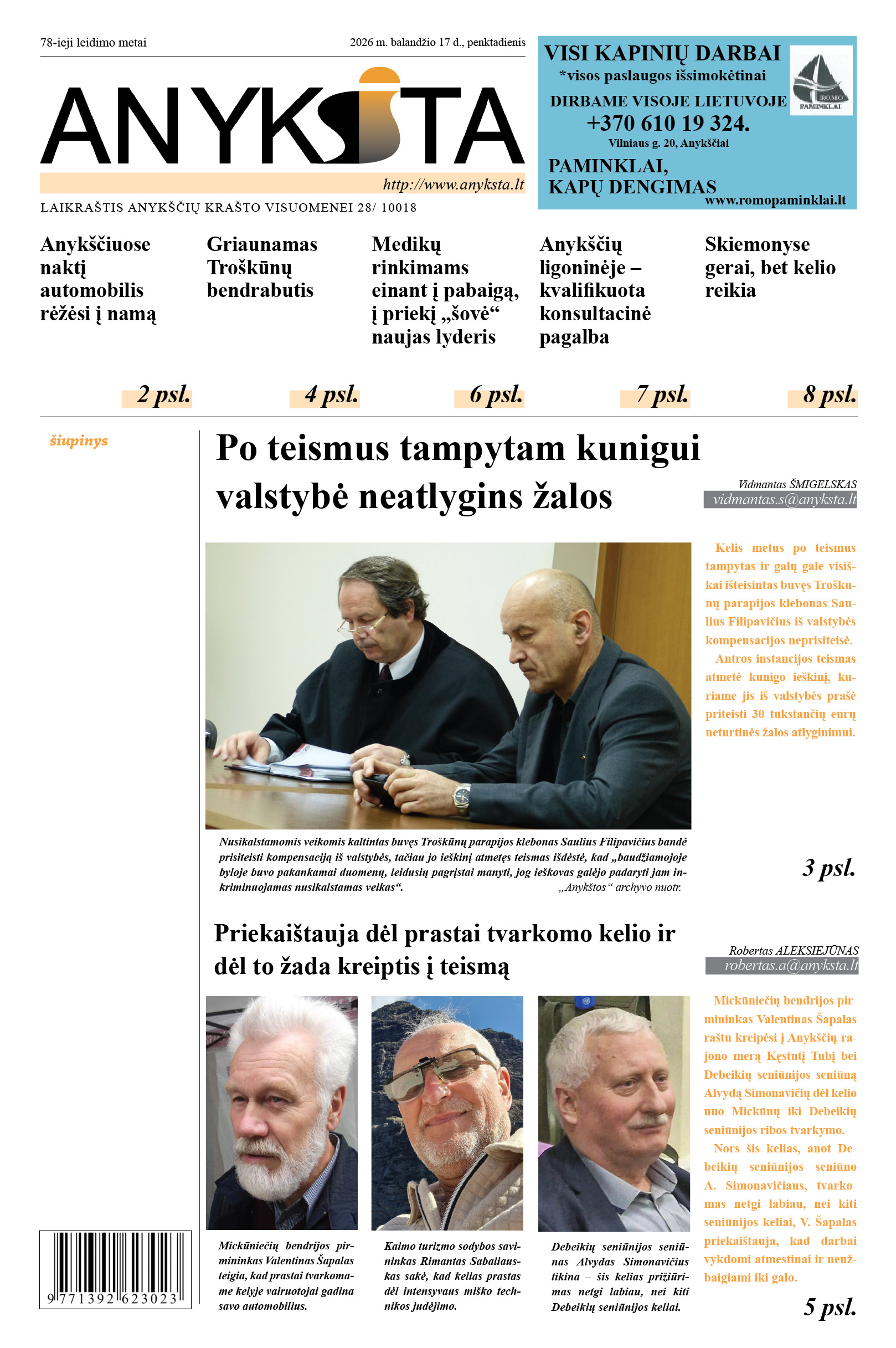 © Anykšta, tel/faksas (8 381) 5 94 58, reklamos skyrius +370 686 33036, el. paštas anyksta@anyksta.lt